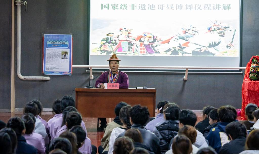随后,活动按照“国家级非遗池哥昼傩舞仪程讲解、池哥昼傩舞动作教授、共舞白马火圈舞”三大环节有序展开。在国家级非遗池哥昼傩舞仪程讲解环节中,余林机老师系统讲解了池哥昼傩舞的起源传说、民俗功能与核心表演流程等,并现场解池哥昼傩舞面具顺序寓意”“池母男性扮演原因”等问题池哥昼傩舞动作教授环节,余林机传承人亲自示范,手把手教授池哥昼傩舞的代表性动作与表演要领同学们在实践中深刻感受非遗舞蹈的神秘与力量共舞白马火圈舞体验环节将活动推向高潮传承人简要介绍白马火圈舞的文化内涵后,带领全体师生跳起火圈舞现场氛围热烈,师生们跟随节奏互动共舞,在沉浸式体验中感受白马民俗文化的热情,增强了对民族文化的认同感与凝聚力。