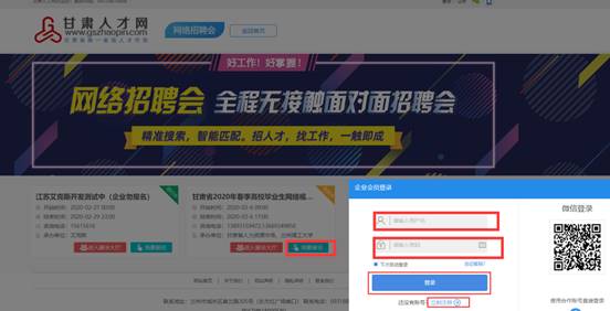 登录甘肃人才网(www.gszhaopin.com),点击菜单栏“招聘会”—“网络招聘会”进入二级页面菜单,进入网络招聘会列表—选择“2021年甘肃省高校毕业生冬季网络视频双选会”点击“我要报名”按钮,登录企业后台(无账号点击“立即注册”,资质通过审核后再报名),待定审核。
