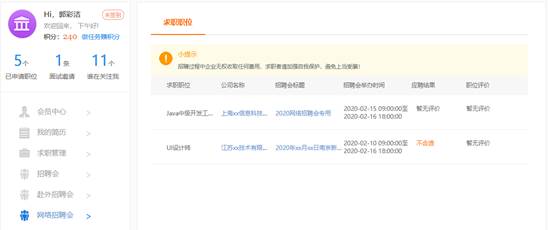 个人用户在个人会员中心-网络招聘会页面查看应聘记录。