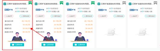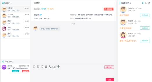 一是主动在“新入场求职者”标签下,浏览入场求职人员简历,点击“立即洽谈”对意向洽谈人员发出沟通申请,并进行面试洽谈。如下图: