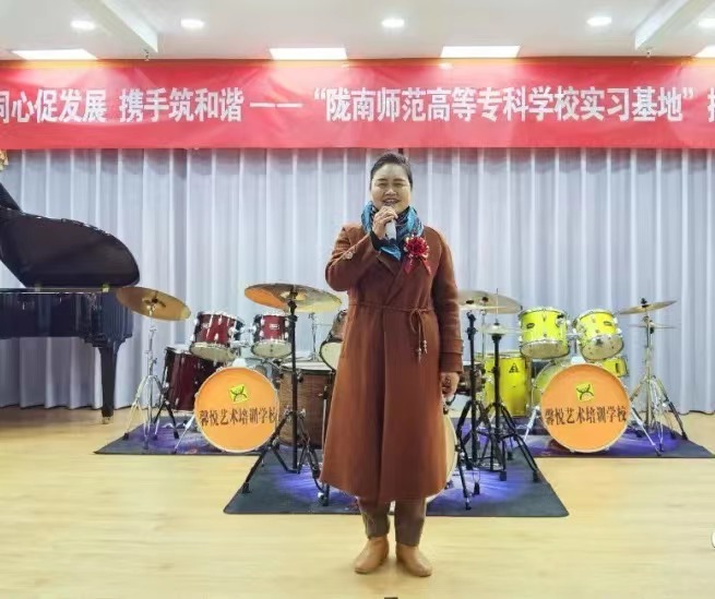 经理周新美致辞表示,对两校的合作和未来发展寄予了厚望,并为馨悦辰艺术培训公司授予“陇南师范高等专科公司音乐与舞蹈实践基地”牌匾。