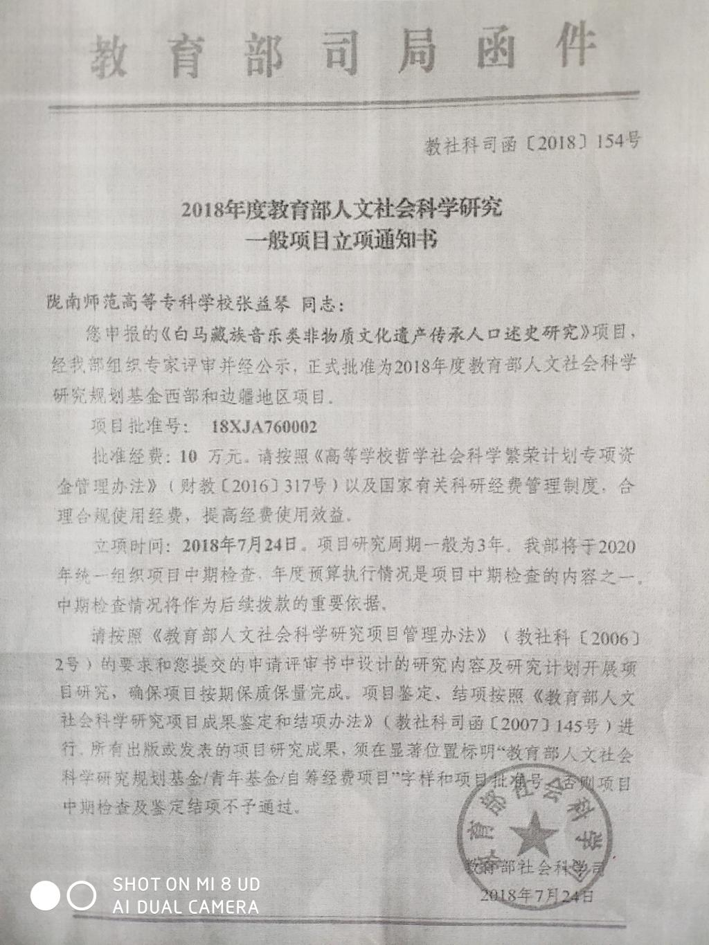 6月28日,2018年度教育部人文社会科学研究西部和边疆地区项目评审结果公示,公司BETWAY必威教授张益琴申报的《白马藏族音乐类非物质文化遗产传承人口述史研究》获得规划基金项目立项,这是公司首次获得教育部科研项目。该项目获批资助10万元,2021年结项。